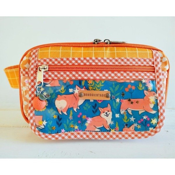 2 bolsillos en el frente: uno de nylon cristal con cierre y broche imán, con lentejuelas variadas, otro de cordura