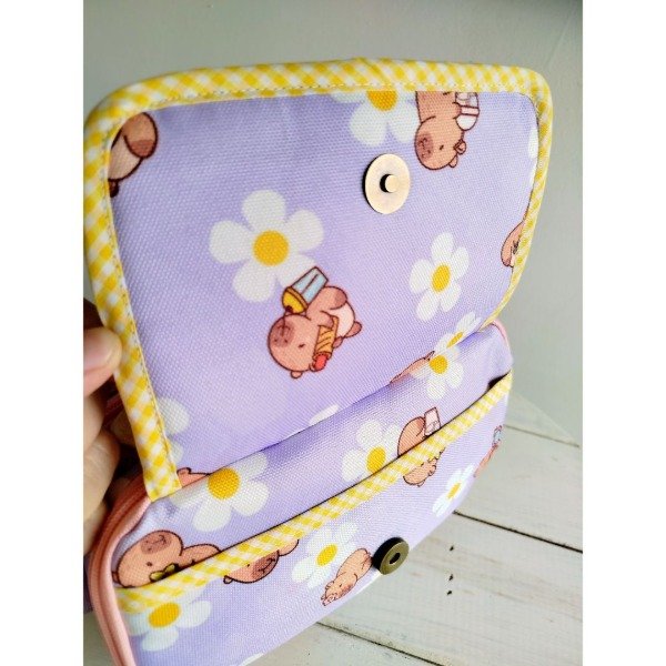 2 bolsillos en el frente: uno de nylon cristal con cierre y broche imán, con lentejuelas variadas, otro de cordura