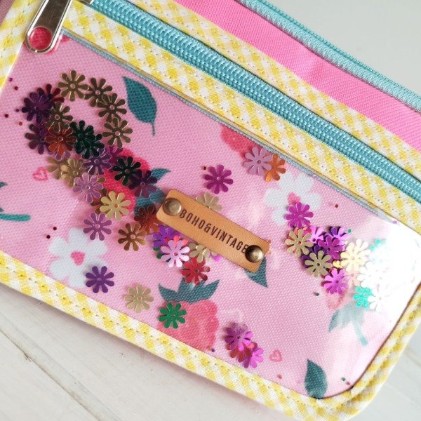 2 bolsillos en el frente: uno de nylon cristal con cierre y broche imán, con lentejuelas variadas, otro de cordura