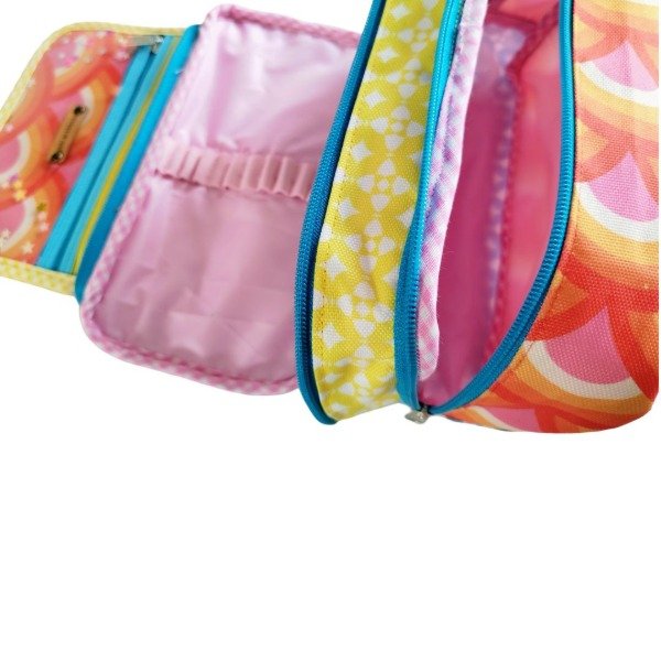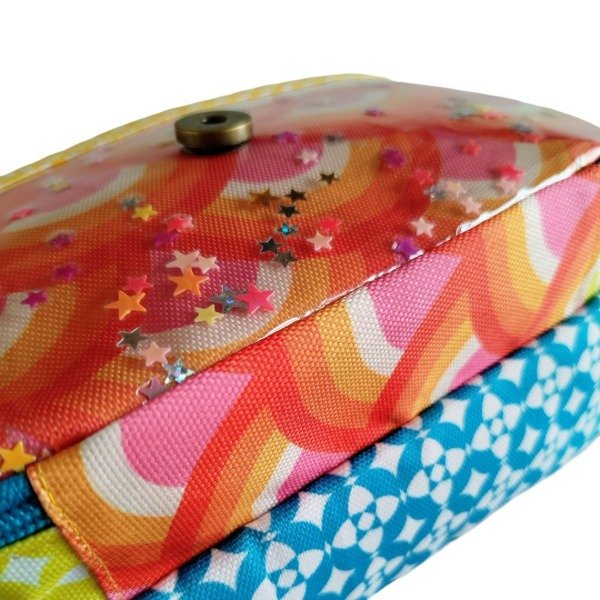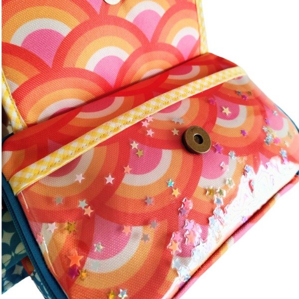 2 bolsillos en el frente: uno de nylon cristal con cierre y broche imán, con lentejuelas variadas, otro de cordura