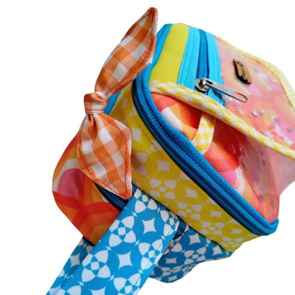 Viene con un moñito en color y estampado surtido que decora uno de los cierres.