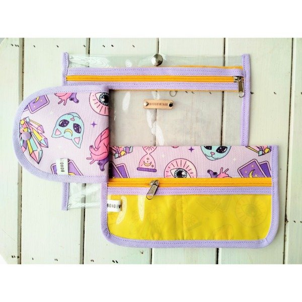 • ESTUCHE CRISTAL DOBLE: 20CM ALTO X 24,5 ANCHO, CON UN CIERRE FRONTAL, UN CIERRE SIMILAR EN DORSO Y UN COMPARTIMENTO CENTRAL CON BOTÓN METÁLICO