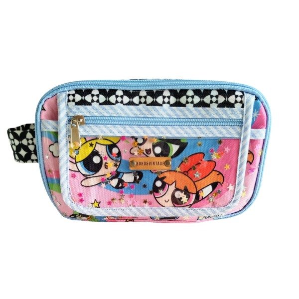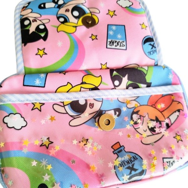 2 bolsillos en el frente: uno de nylon cristal con cierre y broche imán, con lentejuelas variadas, otro de cordura