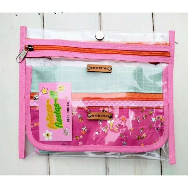 • ESTUCHE CRISTAL DOBLE: 20CM ALTO X 24,5 ANCHO, CON UN CIERRE FRONTAL, UN CIERRE SIMILAR EN DORSO Y UN COMPARTIMENTO CENTRAL CON BOTÓN METÁLICO
